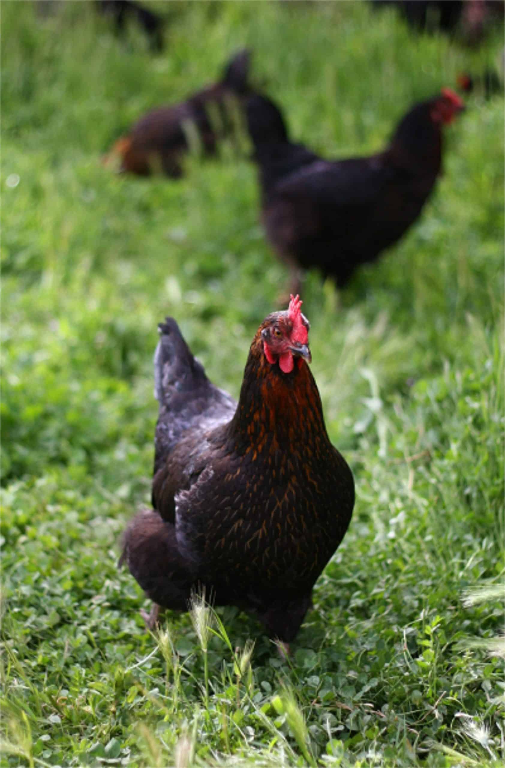 Nearly 400 2-yr-old hens are settling in at Animal Place’s Rescue Ranch, awaiting adoption. The lucky 2-yr-old chickens were slated for slaughter if not for our innovative and cooperative program, Animal Place’s Rescue Ranch. Now the hens are ready for a new beginning…maybe in your backyard! The hens are Black Star sex-linked hens, which are a cross between Rhode Island Reds and Barred Rocks. They are black in coloration with rust-colored lacing.