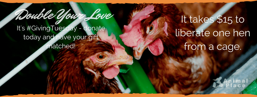 Thank you! You raised more than $32,000 to liberate hens in 2017! It’s #GivingTuesday, an annual celebration of generosity! Kickstart the holiday season with Animal Place by donating $15 to liberate a hen in 2017…and your gift will be doubled! A generous donor is matching gifts up to $10,000. This means, with your help, we