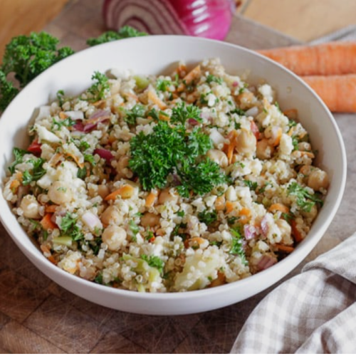 - Once cooled add the carrot, bell pepper, red onion, chickpeas, cauliflower, broccoli, and parsley to the bowl with the quinoa and stir to combine.