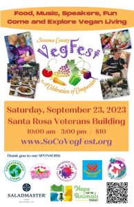 Are you concerned about the state of the planet? The treatment of animals? Your health? Want to learn how to make a difference every day? Then join us for the Sonoma County VegFest, North Bay’s celebration of compassionate, healthy, and environmentally responsible living.  We have a full program featuring dozens of local and bay area vendors with delicious food, animal art, vegan boutiques, non-profits, ethical animal encounters, sustainable and eco products, lots of samples and so much more. We have a full speaker program, vegan cooking and food prep demonstrations, and music all day. Help create a just, peaceful, climate secure world, and join us for a day of delicious inspiration! Learn more about living and vegan life here.