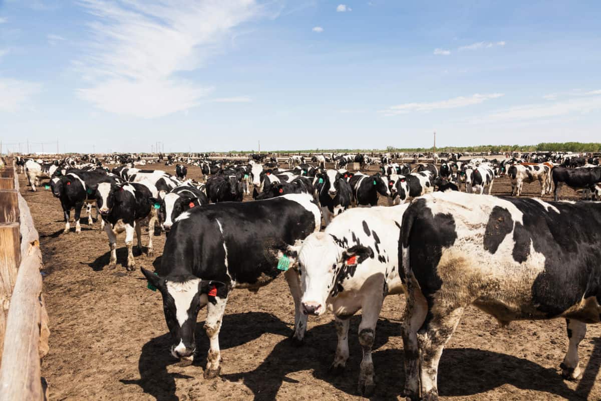 At about a year of age, calves are moved to a dirt feedlot. They are primarily fed grain, which can cause digestive and hoof problems. Calves remain on the feedlot until 18-22 months old and are then sent to slaughter. Feedlots with a capacity of more than 1,000 cows make up 5% of all feedlots but sell 80-85% of all fed cows to slaughter. 40% of all fed cows sent to slaughter come from feedlots with a capacity of 32,000 individuals or larger.