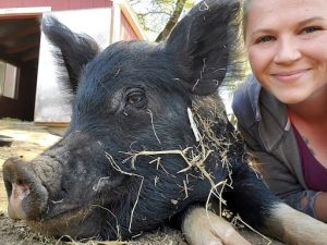 Liz describes Maxwell as having similar personality traits to a dog. He gets excited to greet her, leans his body against her, flops over for belly rubs, and follows her around the yard. Like dogs, pigs will lean into people who they love. It’s their version of a hug! You always know when Liz enters their pasture because you can hear Maxwell’s excited grunts from a mile away. Maxwell and Liz have a friendship that could make anyone smile!