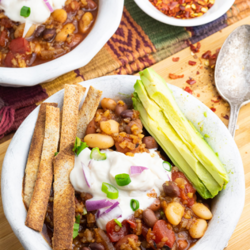 - When the soup is ready, top with my tofu sour cream if desired and chopped chives along with the toasted tortilla slices. Sliced avocados are a great way to knock this over the top.