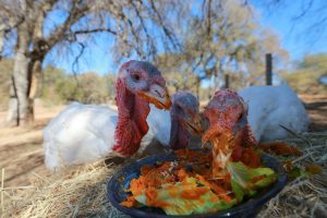 The birds do have one thing in common: they all love treats! Every Thanksgiving, Animal Place has an annual tradition of preparing a feast for our turkeys by welcoming them as the guests of honor. Fresh fruit pies, berries, fall veggies and more will be served to Dino, Echo, Milton and all of their friends.