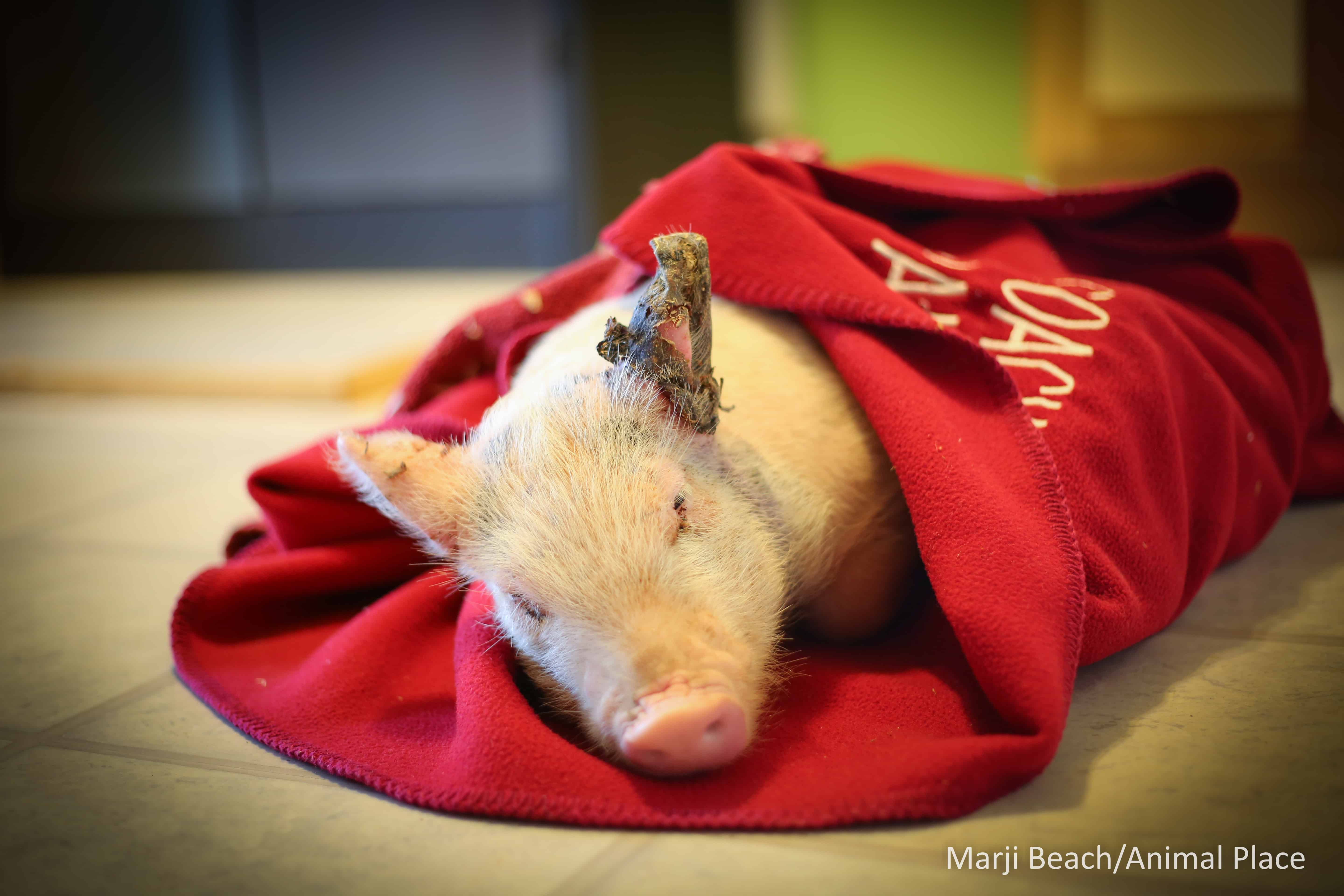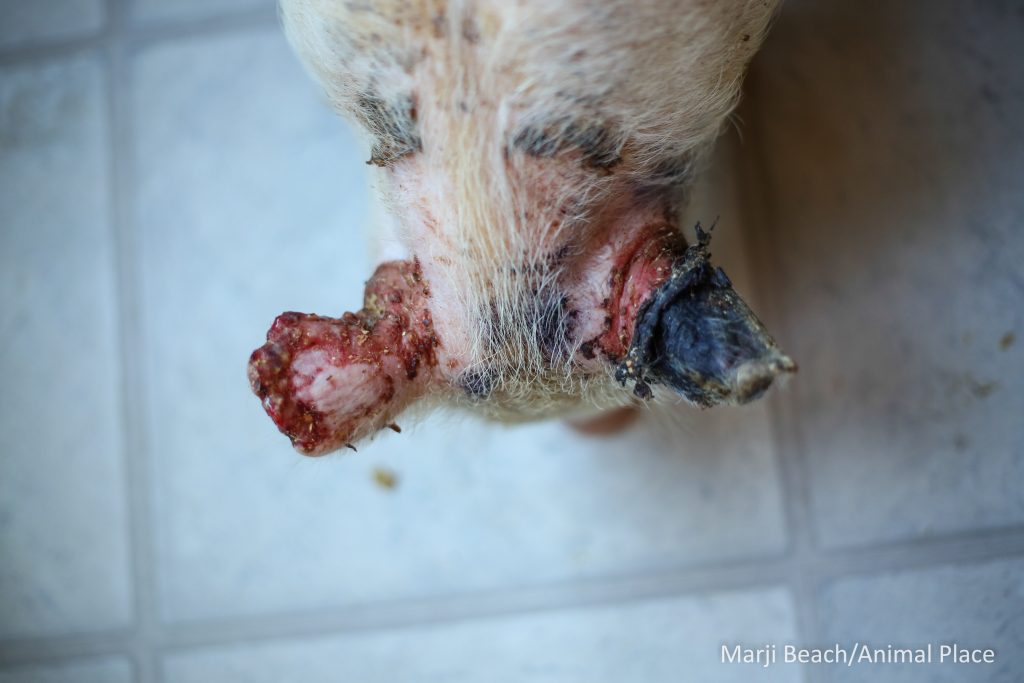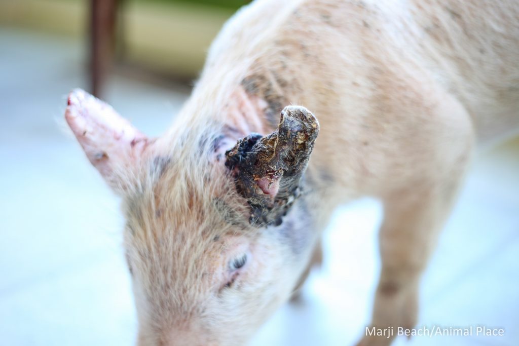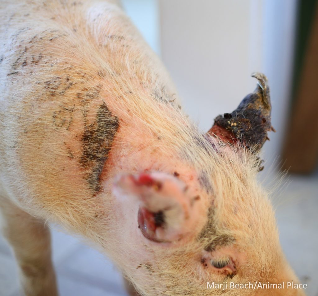 A local neighbor, concerned about the piglet, purchased her and brought her to Animal Place. Â Our veterinarian ended up partially amputating both ears and treating the piglet, now named Cleo, for puncture wounds.