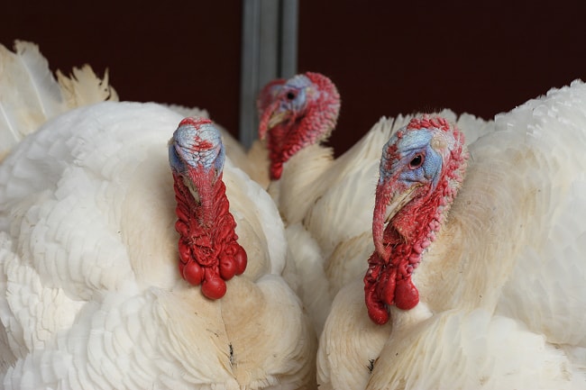 The color of a turkey’s head and throat will change to blue when the turkey is calm, bright red when he is stressed or angry, and a mixture of red, blue, and white when content.