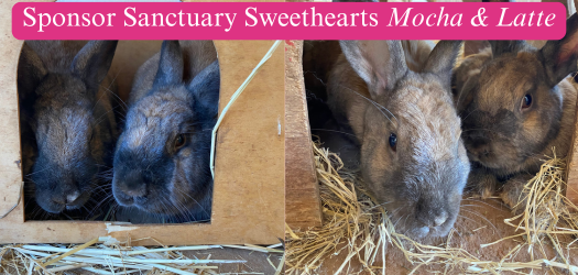 Mocha and Latte A mother-son duo Abandoned at a gas station, Mocha did not stand a chance. Rescuers caught the rabbits. Mocha had become pregnant. Her daughters found homes quickly. But son, Latte, relied on his mother’s presence for comfort and strength. The two found a safe haven at Animal Place. Latte is always near Mocha and the two are often seen cuddling each other. Your $25 donation sponsors Mocha & Latte, and provides them with hay for two weeks. The rabbits are free-fed timothy hay, as bunnies need a constant source of forage.