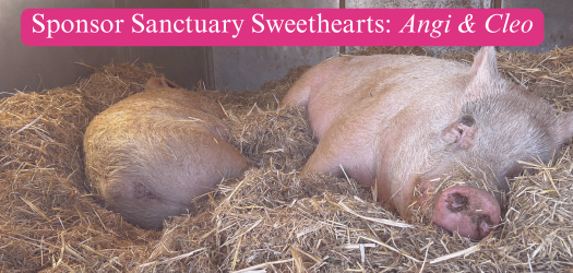 Cleo and Angi A friendship from heartbreaking loss Angi spent her life in a dark barn, confined to a 2’x7’ crate. Her piglets did not survive, and her best friend passed soon after rescue. Attempts at integrating Angi in with the adult pigs failed. Then, we rescued Cleo. A feed-store dumped her in with larger piglets. Cleo suffered bite wounds and her ears were amputated. Cleo and Angi hit it off immediately and have been together ever since! Your $25 donation sponsors Cleo & Angi, and provides them with a month’s worth of deep straw bedding during the winter.