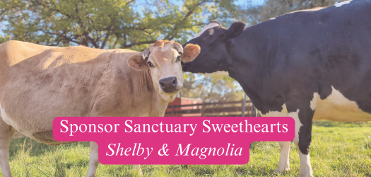 Shelby and Magnolia Best friends and adoptive sisters forever Shelby and Magnolia are survivors. Shelby escaped a dairy and was found on the highway. Magnolia cannot get pregnant and was given away. Both arrived nearly ten years ago. Shelby seems independent, but relies on Magnolia. The two are found side-by-side or engaged in intense grooming sessions. Your $25 donation sponsors Shelby and Magnolia, and provides them with a day’s worth of food!