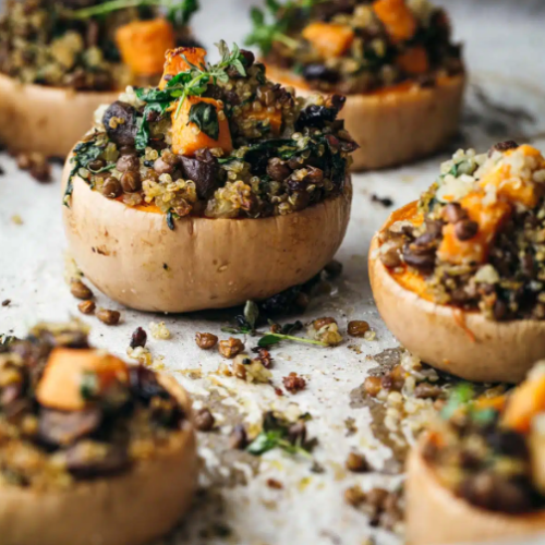 - Keeping the oven on, take the partially cooked squash rings from the oven and place them on your kitchen counter. Carefully, fill each ring with a good amount of stuffing, drizzle each with a small amount of olive oil before placing them back in the oven for a further 20 - 30 minutes or until the squash is cooked through.