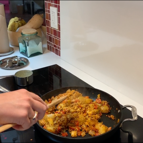 - Cook the onion and bell pepper on medium heat in a frying pan.