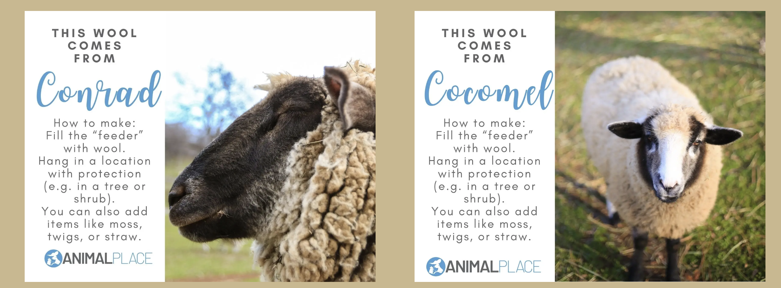 If you donate $30 or more, we’ll send you a sponsorship card, wool from your sponsored sheep, container, and instructions on how to share the wool with the birds. You’ll be sent wool from one of the four sheep below!