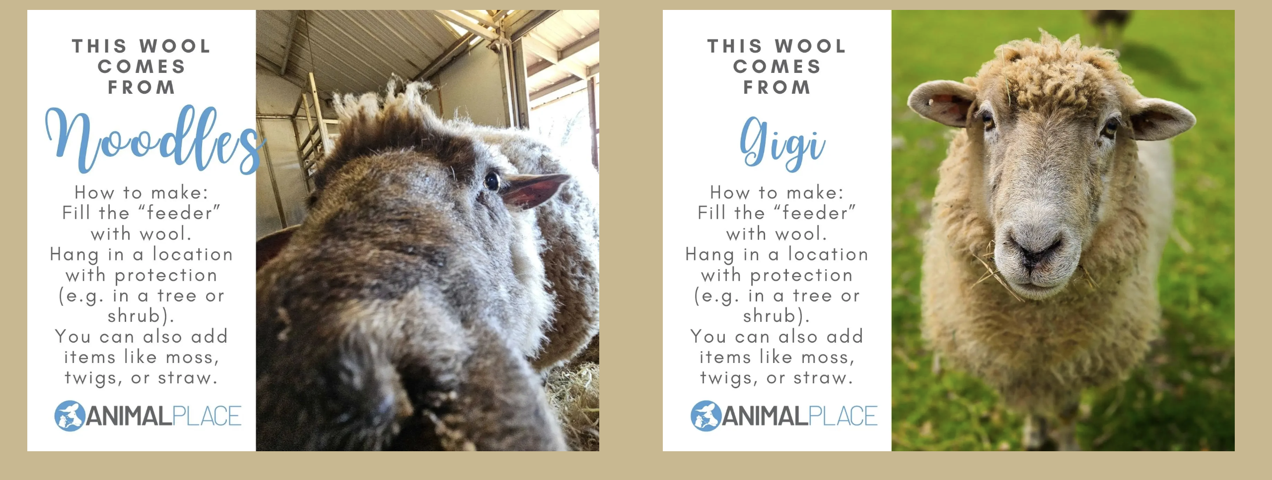 Your gift goes toward shearing the rescued sheep and keeping them healthy! If you donate $30 or more, we will send you a small sample of wool, hanging container, and a sponsorship card. The wool can be hung outside for the wild birds! (Wool and container will not ship until week of April 28, 2025)