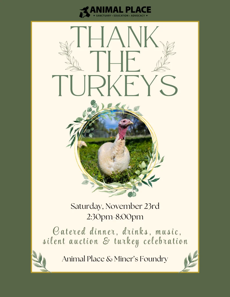 Honor the turkeys and birds with a pumpkin pie ceremony at our sanctuary in Grass Valley before heading over to the historic Miner’s Foundry in Nevada County to indulge in a savory vegan catered dinner from Plant Farmacy, bid on exciting silent auction items & help raise funds for rescued animals in need!