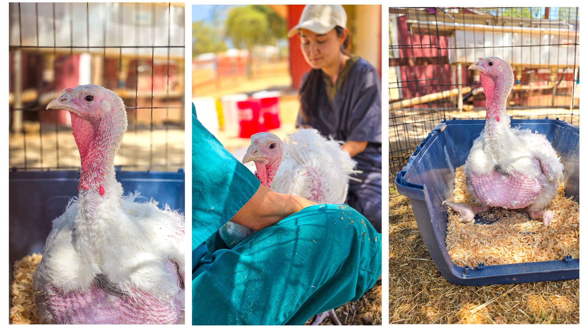 She’s also severely overweight, tipping the scale at 27 pounds. For comparison, our other turkeys weigh closer to 13-14 pounds. Tilly will need to shed about 12 pounds to live her best life. She’s now on a special diet and has already won over our hearts with her sweet, gentle spirit.
