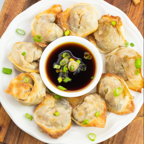 - Air Fry- This is my preferred method because it gets the dumplings nice and crispy on the outside. Place dumplings in your air fryer basket in a single layer and set to 400°F for about 7 minutes. You will need to cook them in batches because there will be so many, but they don’t take long. Check them after 5-6 minutes, and stop the cooking process once the edges become golden brown.