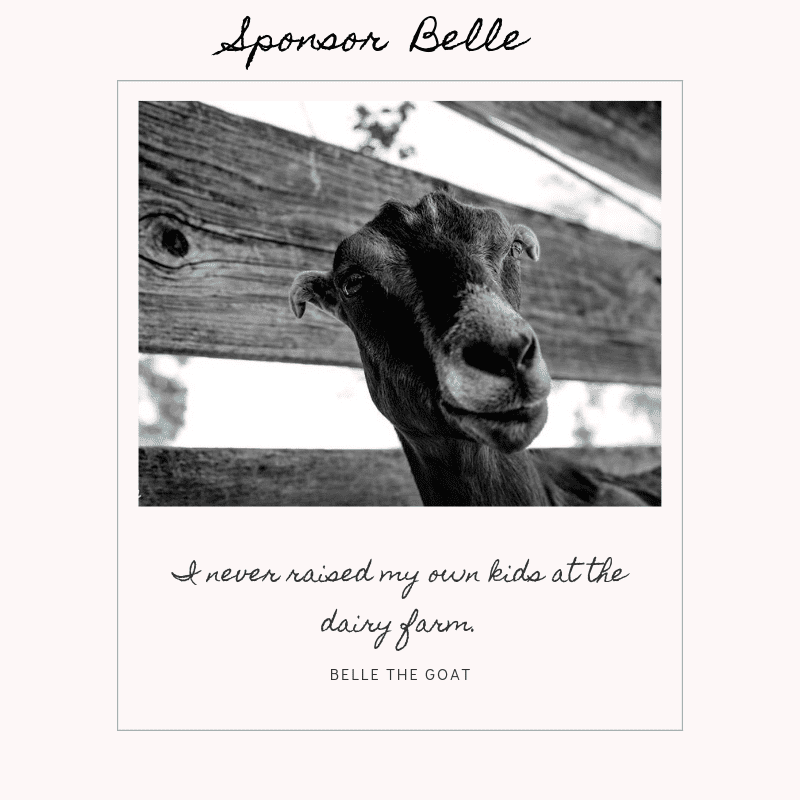 Sponsor Belle, who was born on a goat dairy and taken from her mom right after birth. She too had her kids stolen from her so her milk could be sold for human consumption.