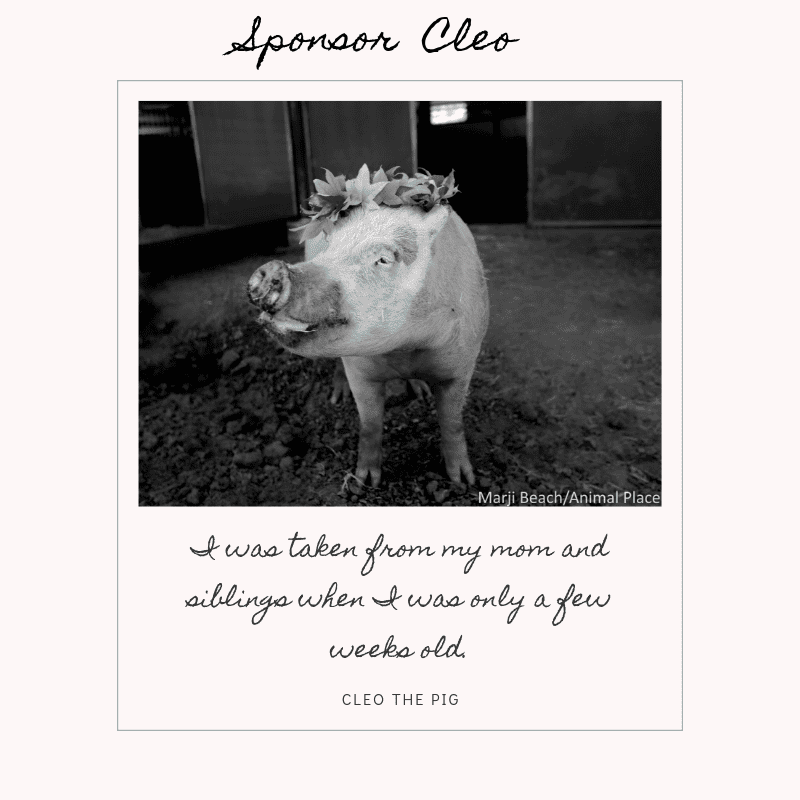 Sponsor Cleo, who survived horrific neglect at a local feed-store. She was taken from her mom and siblings at a few weeks of age, and placed into a cage with much older piglets who attacked Cleo, leaving her covered in bite wounds.