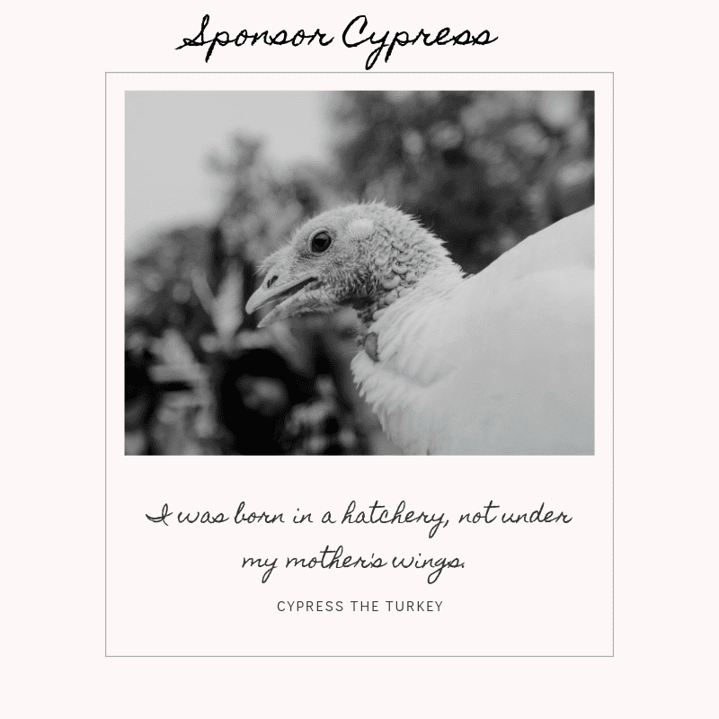 Sponsor Cypress, a turkey hen hatched in an incubator instead of beneath her mother’s wings.
