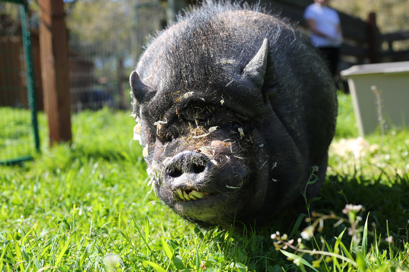 Wilbur is large, pink, and loves humans. He spent the past five years in a 20×30′ dirt pen with no enrichment. His muscles are weak from lack of exercise and he suffers from an untreated fungal infection in his ears. Anastasia the potbellied pig spent the past decade in a 15×20′ dirt lot. She is severely overweight and can barely see, the skin around her face has folded over, obscuring her sight. Because she has not been allowed to forage, her lower teeth have not worn themselves down, now pointing awkwardly out of her face.